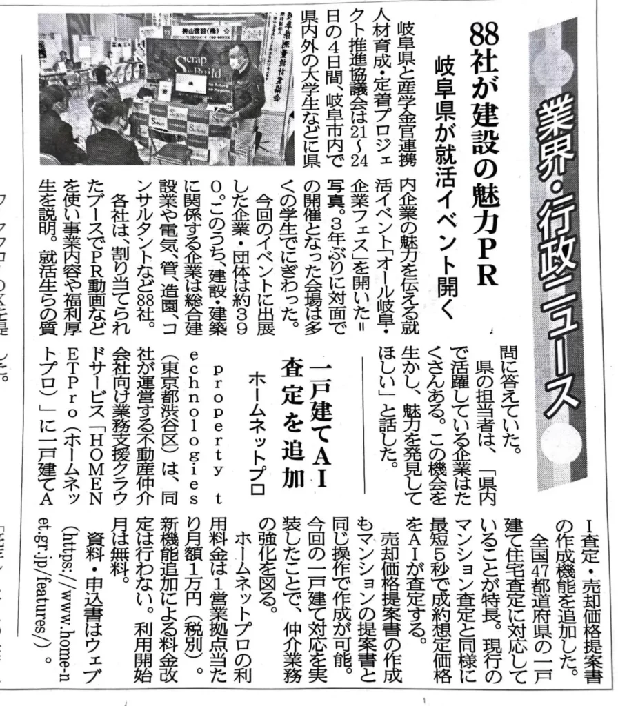 この就活イベントは3月1日建通新聞にも掲載され、美山建設のブース写真が採用されました。