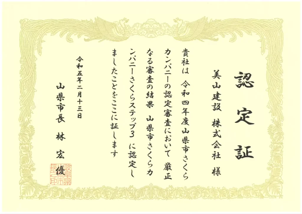 このたび、ワーク・ライフ・バランス推進や女性活躍推進に積極的に取り組む企業が対象となる「山県市さくらカンパニー」さくらステップ3に認定されました。認定式には弊社社長が出席し、その模様は3月10日岐阜新聞にも掲載されました。これからも社内の意識改革をはかり、職場環境の改善に努めます。